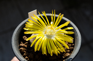 コロナ玉開花 2017-11-08 by henmix コメントする 日輪玉系のリトープスのコロナ玉(Lithops aucampiae ‘Corona’)が咲きました! こちらは9月末の寫眞。 咲く氣配は感じられませんでした。 それが11月に入り、開花しました。 寫眞は11月3日に撮つたものです。 鮮やかな黄色で良いですね! そして二日後の5日、花が大分大きくなつてゐるのが判ります。 よく見ると、雌しべの開き具合も凄いです! 殘念ながら交配相手はをりません。 チョットもつたいないですね(笑)。