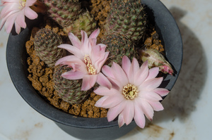 レウカンテマ(っぽいの)も開花 2024-05-31 by henmix コメントする レブチア(メディオロビビア)のレウカンテマ(っぽいの)(Rebutia leucanthema aff. HJ 490 (Rancho Santa Rosa, Bolivia))も咲きました。 株自體も大分充實してきたやうに見えます。 寄せ植ゑにしてゐるため、閒に咲いてゐる1輪はひしやげてます(綴化風ですね)。 (これに限らず)植ゑ替へをサボつてるので、夏になる前に植ゑ替へたいですね。 初夏を感じさせるやうな爽やかな色合いで、なかなか素敵ですね。